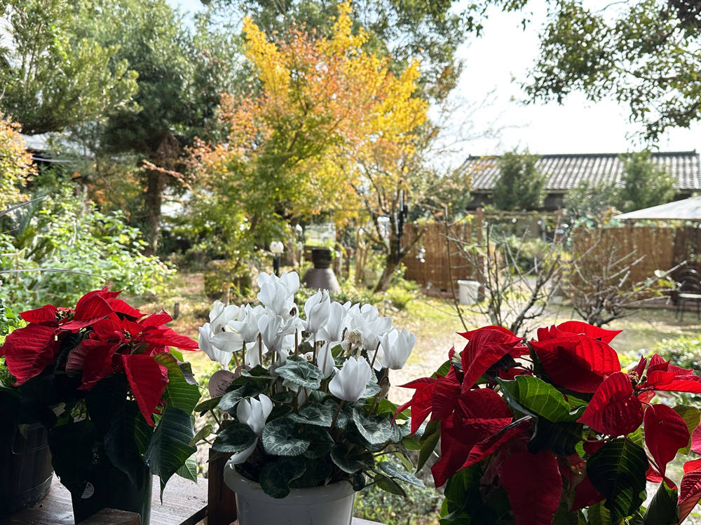 さらに、庭には、春の訪れを知らせる梅が古民家の前に、そして中央に大きな桜の木が2本、春の宴を演出します。初夏には、お店の門に植えた薔薇の花がお店に彩を与えます。 夏になると庭の各所に植えた草花が咲き乱れ、白い百日紅の花が店への道をトンネルのように覆います。 秋になると金木犀の花がその妖艶な香りを庭中に漂わせ、晩秋になると銀杏、紅葉が燃えるような秋を演出し、落ち葉になるとともに冬を訪れを知らせてくれます。 そして、冬になるとピンクと赤の椿が咲き乱れ、その花に多くのメジロたちが訪れ、可愛らしい歌声を聞かせてくれます。